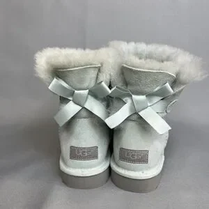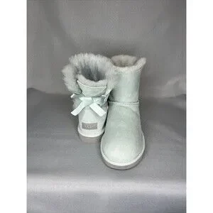 These gorgeous women's UGG Australia Bailey Bow boots in a beautiful, aqua or light blue-ish green color come in a size 8. The shearling lambskin sheepskin suede fabric and wool insole will keep your feet comfortable, warm and cozy, while looking your best! They are perfect for any occasion, from casual around town to fun at a festival. These boots are adorned with a charming bow accent lining the heel and lined with soft sheepskin. The rubber insole material ensures durability and traction, making them suitable for outdoor or indoor adventures. They are a range from dopamine, Christmas, holidays, clubwear, cottagecore, girl-core, Lana Del Rey, coquette, or festival chic vibes. These UGG Australia Bailey Bow boots are in a women's size US 8. Hard to find color in this condition! I specialize in unique colored Uggs, so check out my other listings and feel free to message with questions and offers!