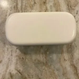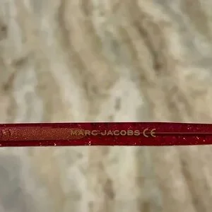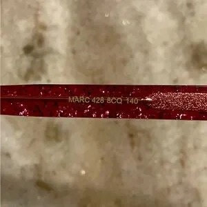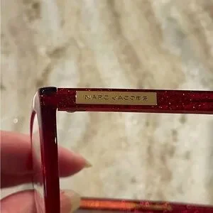 This is a great frame from Marc Jacobs with a translucent red on the front and red with gold sparkles on the earpieces. It has a nice cateye shape. Both the frame and the case are in excellent condition.