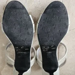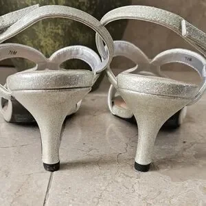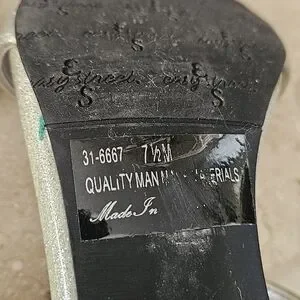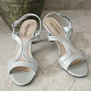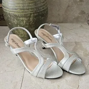 Cute Easy Street open toe sandals with 3" heels. Sparkling grayish color with tint of light green. Excellent pre-owned condition. Size is 7.5