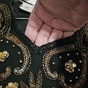 Rare, gorgeous, cocktail, sexy little black dress. The beading and silk are beautiful, I do not see any flaws, with the exception of a small area of missing beads on the back left upper shoulder pictured last. I bought this and other gorgeous clothes & shoes at a high end estate sale last summer. I bought the whole closet out as there was something in there I really wanted;)