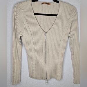 Lovely long-sleeved knit sweater. Color is a creamy tan. Knit detail on front. Double zip zipper. Zipper pulls are jeweled!