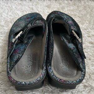 These Alegria Classic Copacetic Exclusive Multicolor Clog is a great pair of slip resistant shoes. The insole is replaceable. These have wear mainly on the outside of the right foot.