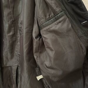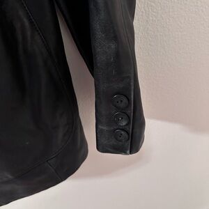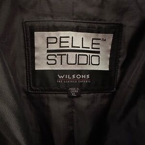 High quality black vintage leather button up jacket from Pelle Studio and Wilson’s leather. Size XL. Has two front pockets and one inner. Some signs of love and wear- one sleeve button is missing.