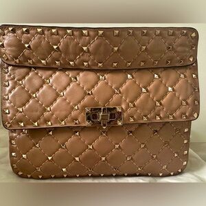 Medium Valentino Garavani Rockstud Spike Bag crafted from soft Nappa lambskin with a chain detail. Features a quilted design accented by small platinum-finish studs. Includes a detachable sliding chain strap and a removable handle, allowing it to be worn as a crossbody, shoulder bag, or carried as a handbag.
