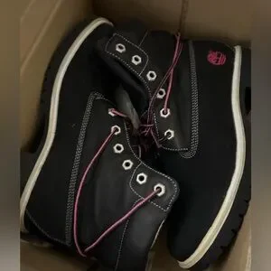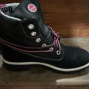 Women’s black and pink roll top Timberland boots. Pre-owned, in good condition. Some scuffs.