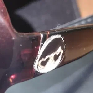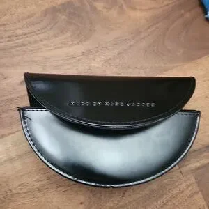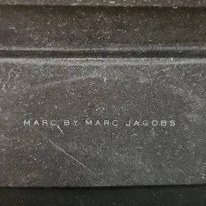 From the early 2000s, sunglasses by Marc Jacobs have a girl on each side of the arm. The case is no longer magnetic, but it is in fair condition with some fading. the right lens has a scratch.