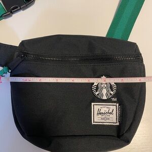 Super cute Herschel Starbucks hip pack/belt bag in excellent condition. The bag is clean and looks unused. There is a small discoloration on the inside of the strap, not visible on the outside. Please refer to photo.