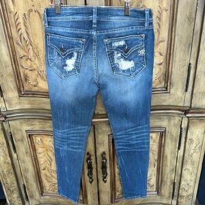 Miss Me distressed skinny jeans with distressed back pockets with faux flap. Two front pockets. Button and zip closure. Front whiskering and distressed details. Size 27. Inseam is approximately 29 inches