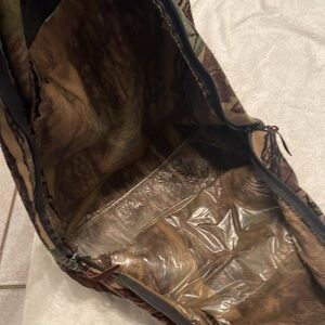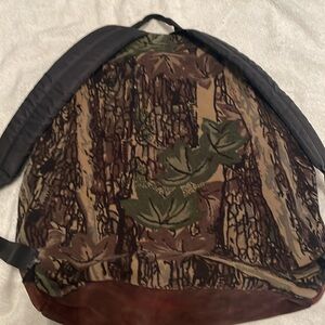 Gander Mountain camouflage backpack. Suede brown bottom and flannel type exterior material. Worn condition, suede needs cleaning and pilling. Some of the plastic interior is gone. Backpack still perfectly functional.