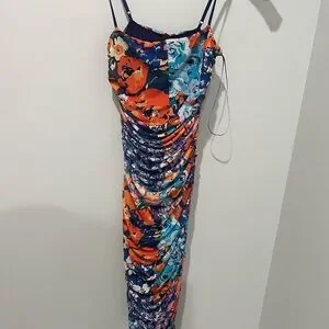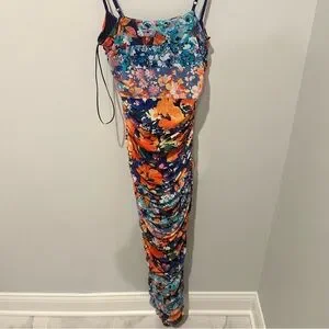 NWOT AFRM Floral Printed Ruched Mesh midi Dress - size Small