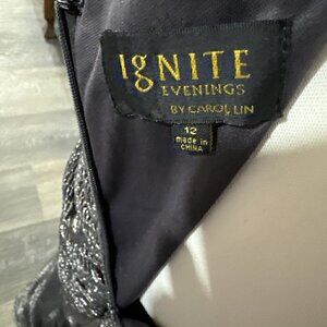 This beautiful gray sparkling halter evening gown with sequins around the neck is the perfect addition to your wardrobe. It is designed by Ignite and is a regular size 12. The sleeveless dress is perfect for any occasion, whether it's a wedding or a formal event. The dress is made with high-quality materials and has no personalization instructions. Make a statement with this stunning dress that will make you stand out from the crowd.