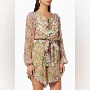 HEMANT & NANDITA Nora Romper in Viscose Green Pink Paisley Print Long Sleeve Lace Detail. Size small. Boho, bohemian, casual, comfy, comfortable, beach, beachy, vacation, resort, cruise, floral, flowers, resortwear, preppy, beachwear, bid day, sorority, luxury. Missing belt and has a few threads loose. Please ask all questions prior to purchasing so there is no confusion! Make me an offer๐