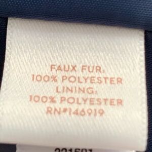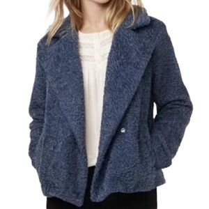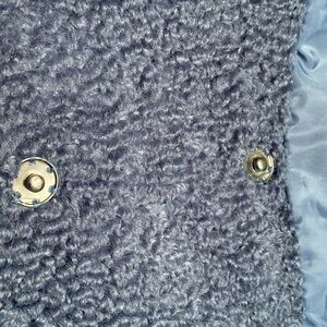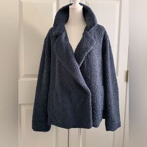 Size: XL. Dark Slate Blue Color with overlap front pea coat style with two snaps for closure (see pic's). Textured teddy bear fur style material. Can be worn casual with jeans or pants or with a dress or skirt. Comfortable silky lining and two outer pockets in front. Pit to pit: 24” stretches to 25”. Length: 26”.