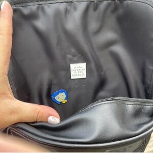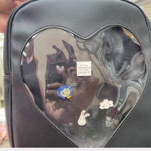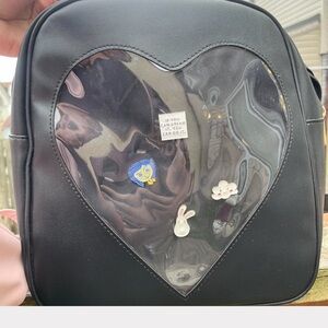 This listing is for both bags, the pink Crossbody ita window pin bag and the black heart window pin backpack!! Both vegan leather. The black backpack has a removable insert that you can put the pins on. The pink Crossbody is a little different because it doesn’t have the removable insert. They were made that was, Nothing is missing. The pink bag has never been used, and the backpack was used once. They do come with a few pins.