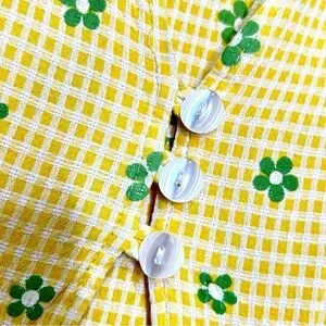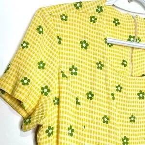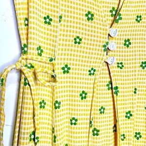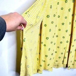 Vintage 90s Flower Power Gingham Maxi Dress Layers Gathers Ties Yellow Stretch S