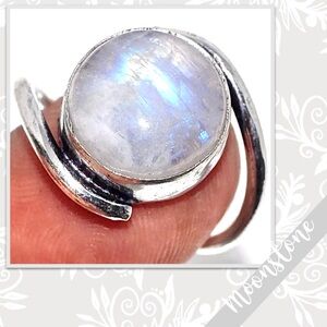 Rainbow Moonstone Silver Artisan Ring, Size 6.5 (Pearl White, Blue-Violet flash)