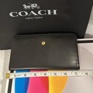 Hard to find coach vintage wallet it’s the original all black leather wallet with gold snap.no dust bag