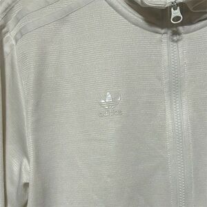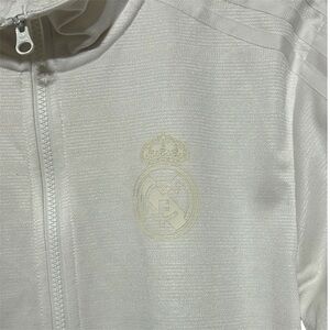 Show your support for Real Madrid with this stylish Adidas jacket. Crafted with the finest quality materials, this jacket is perfect for any soccer fan. The white color and medium size make it a great addition to any fan's collection. The jacket features the iconic Real Madrid team logo and Adidas branding, making it a must-have for any soccer enthusiast. Whether you're heading to the game or just showing off your team spirit, this jacket is the perfect choice.