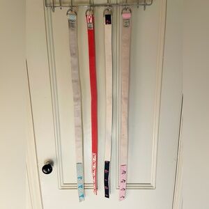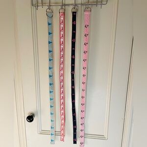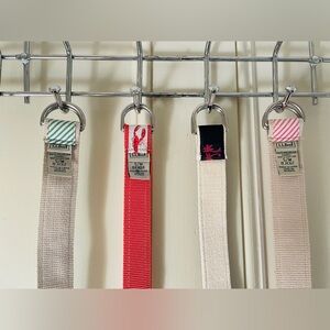 4 belts: sailboats, lobster, palm trees / flamingos, and anchors. All size women’s Small / Medium, about 40 inches long. 3 are LLBean, 1 is not. A few have mild discoloration and one has a small paint stain (see photos). Great for a preppy / sailing look! Price is for all 4 belts, not selling separately.