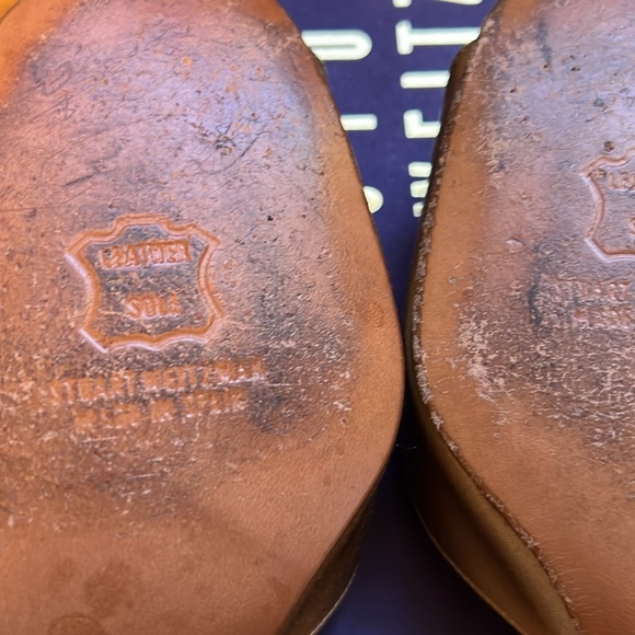 Stuart Weitzman evening sandal. Satin gold toned. Size 9. Rhinestone embellishment.