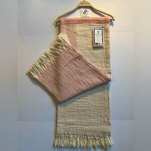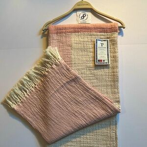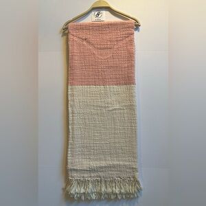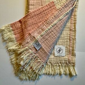Oversized and textured throw blanket in a pink color block of oatmeal and shades of pink and loose ivory fringes