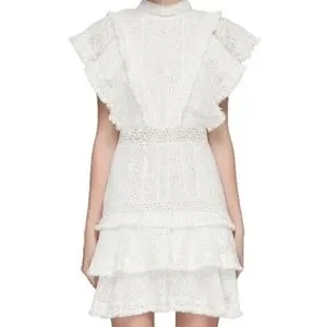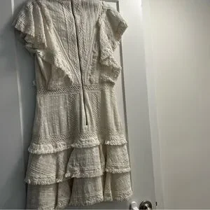 White dress with lots of gorgeous detail. Eyelets at waist, tiered skirt, ruffle top, lace mock neck.