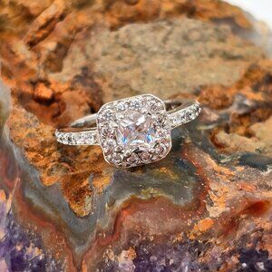 A stunning sterling silver 925 engagement ring featuring a cushion cut Cubic Zirconia center stone and sparkling side stones.