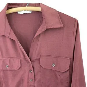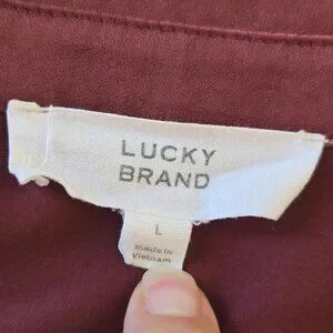 In the realm of wardrobe essentials, this Lucky Brand tunic emerges as a hero of style and comfort. Its deep burgundy hue echoes the tranquility of twilight, while the smooth polyester fabric drapes gracefully. Complete with a classic collar and practical pockets, it promises both elegance and utility.