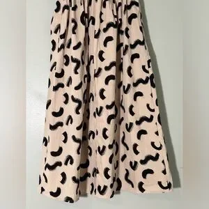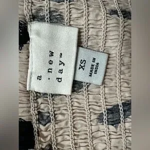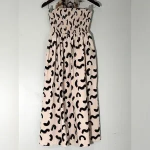 This stylish A New Day strapless smocked tube top midi sun dress is perfect for warm weather occasions. Made from 100% cotton, it features a versatile cream color with elegant black accents. Designed to be dressed up or down, this preowned dress is in excellent condition with no damage or stains. It has a flattering fit, with a smocked top for added comfort and style. Ideal for casual outings, summer gatherings, or paired with accessories for an elevated look.