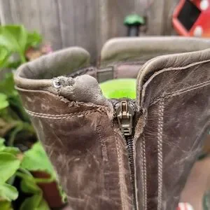 Good Condition. Distressed. Brown Leather Boots. Water Proof. Slight Damage from Puppy on inside left boot by zipper pull. Shown in photos. Hardly noticeable.