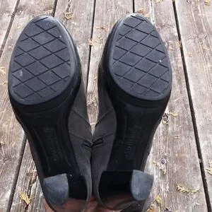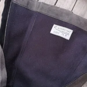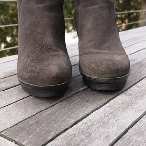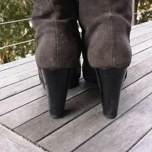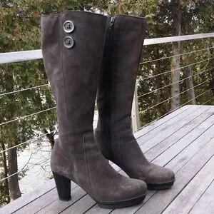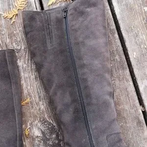 Beautiful tall suede leather heeled boots from La Canadienne. I would call them dark gray, but in some light they look even brownish. 3 inch heel and a bit of a platform on the sole which makes them pretty cool-looking. In very good used condition; there are the typical flattened areas on the suede at the toes and backs, and some minor small spots throughout. Also a tiny imperfection on the back of the right boot. Please see last photo for this: you can feel a wee tiny hole from inside the boot but it doesn't go all the way through. Size 7.5. Beautiful boots!