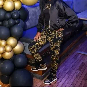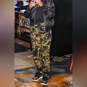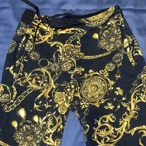 Black and gold print Versace jogger sweat pants size zipper pockets and drawstring. Loose fit so can fit someone a little larger in size. Cute when paired with Versace shoes or sneakers. Versace shoes available on my page to pair with joggers. Non smoking and no pet home. Shirt & Jacket available/ for sale upon request