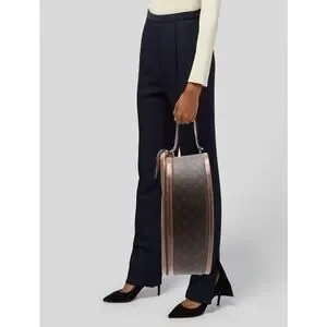 • This vintage hat box features a top handle, monogram coated canvas, brass hardware, leather trim, single interior pocket, zip closure at top, and protective feet at base.