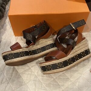 Louis Vuitton boundary wedge sandal, women’s size 7, comes with box dust bag, and original receipt. Excellent condition.