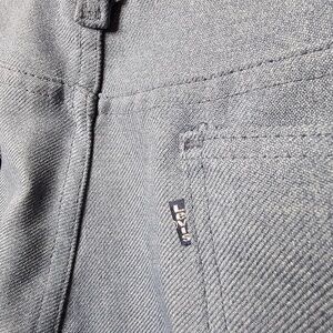 These vintage Levi's slacks feature a unique light blue or heathered blue color, setting them apart from typical jeans. They appear to be made from a comfortable, possibly polyester or poly-blend fabric, offering a smooth drape and relaxed fit. The pants maintain a classic five-pocket style with belt loops, a button, and zipper closure, embodying a timeless silhouette. Their vintage nature adds character and a unique, bygone era appeal.