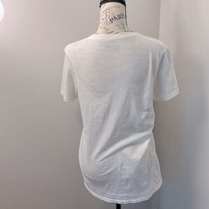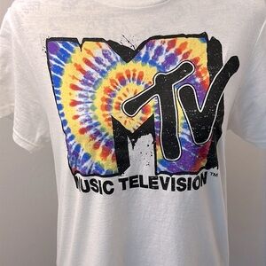 This MTV tee is available in a size small. It is brightly colored Tye dye with black letters on a white background. Pit to pit measures 18.5” and length of skirt is 26” This shirt is in very good pre owned condition with only one small imperfection. There is a tiny hole in the left armpit. Fabric content is 100% cotton. Follow laundry for best results. See last photo. This item comes from a smoke free environment.