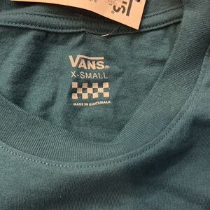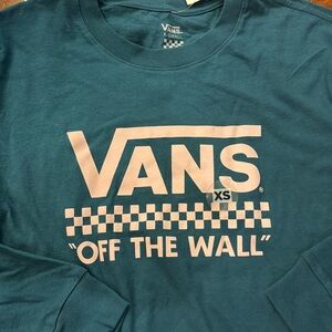 NWT Vans women’s XS long sleeve shirt. Bluish green in color with light pink lettering on front. Cropped.