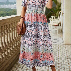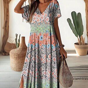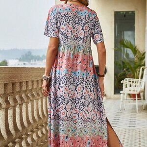 Multicolor Boho Women's Printed Short Sleeve Dress With Split Hem