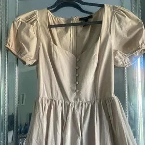 Featuring a sweetheart neckline, puff sleeves with elastic, button-front closures, an A-line silhouette, and concealed back zipper. 100% cotton. Fully lined.