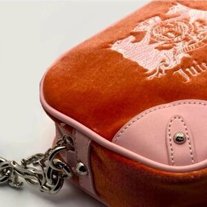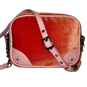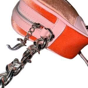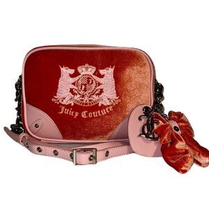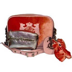 EUC - Juicy Couture Hollyhock Peach Velour and Pink Faux Leather Crossbody Camera Bag. Limited Edition, sold out bag that was only available overseas. Rich in nostalgia, the Hollyhock is synonymous with the height of JC’s reign. Romantic and feminine detailing is blended with iconic crest contrast embroidery, which allows for a renewed and contemporary take on a classic. Comes with metallic mini pouch, velour bow, heart mirror, and gothic logo keychain. In excellent pre-loved condition with no visible wear to the bag. The mini pouch is missing its strap with clip and the heart mirror has scratching. Offers welcome!