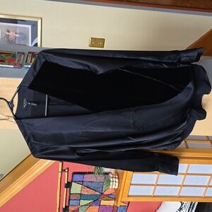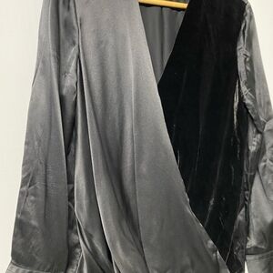 Rag and Bone Victor black silk and velvet surplice blouse. Gorgeous blouse with long sleeves, v neck. Half black velvet in front and half silk. Drape is lovely. Longer shirttail hem in back. Chic, classy and sensual blouse. Pair with my lambs leather shorts or black velvet midi skirt. Approx. 24"-30" hi-low hem. Crossover surplice front. Inverted pleat in back.