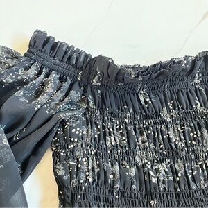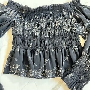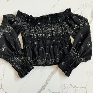 Allsaints smocked top, off the shoulder neckline. Black chiffon with cream floral pattern. Smocked body with peplum waist. Sheer ballon sleeves with smocked wrists. Only worn a few times and in great condition. Size 8