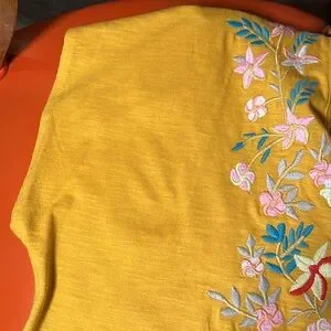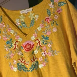 Butternut colored T-shirt with beautifully embroidered flowers around the neckline and at the back of the neck.