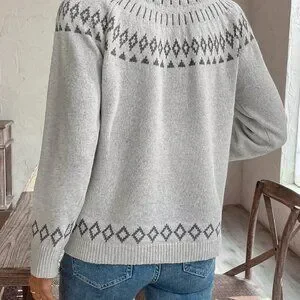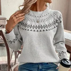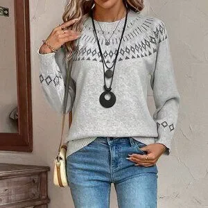 Grey Casual Women's Crew Neck Geometric Print Long Sleeve Sweater