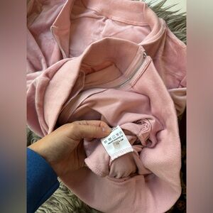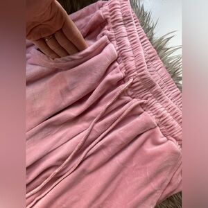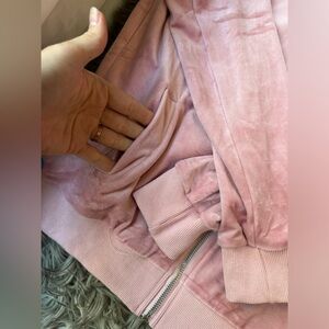 Mrs George mean girls costume that includes a pink velour track suit, both the pants and jacket are a size small. The pants are a more fitted jogger style ankle with a tie waist and pockets. The jacket is a full zip, slightly cropped and pockets.