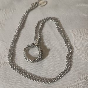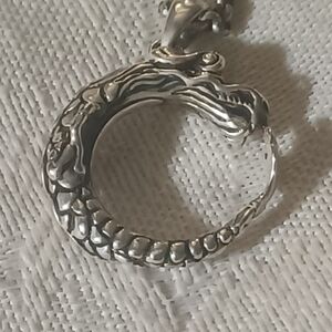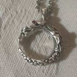 Fabulous and Fun! John Hardy Legends Naga Dragon Necklace. A classic JH Naga Dragon in the shape of a circle. This Dragon has great details and, on one side, has a ruby eye. The Dragon pendant is just over a half inch, excluding the bail. This is on a nice 17.5-inch rolo chain with lobster claw clasp. There is a tag hanging by the clasp that says Hardy on one side and JH 925 on the other. This piece is in excellent pre-owned condition.