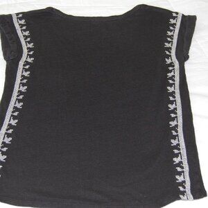 This flattering and multi-season tee has cap sleeves with rolled cuffs (fixed/ tacked), a scoop neckline, and a relaxed fit. The cross-stitched geometric embroidery detail, in gray, runs up each side and over the shoulders, same on the front and back.