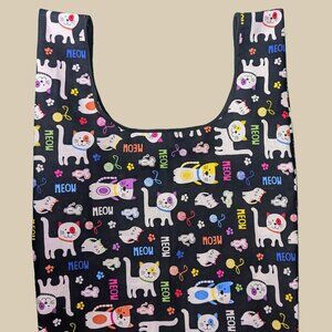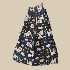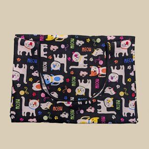 Hand crafted at home. This bag is made with lightweight cotton fabric. The fabric has a colorful cat pattern.