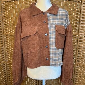 New Women’s Long Sleeve Button Plaid Corduroy Cropped Barn Jacket Size M