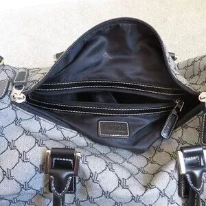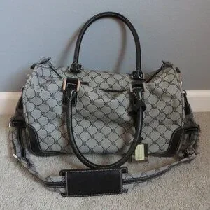 This vintage duffle carry on bag from Lauren Ralph Lauren is a stylish addition to any wardrobe. The exterior is made of durable canvas in a beautiful gray color, with black leather trim accents.